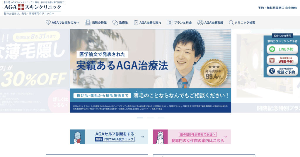 AGAスキンクリニックは、薄毛・抜け毛治療に特化した国内最大級のAGAクリニックです。