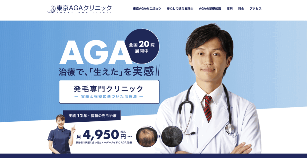 ![]() 東京AGAクリニック | 無料カウンセリングで医師に相談できる オーダーメイドAGA治療を月4,950円(税込)〜始められる 対面で的確な診査を受けられる | 詳細はこちら |