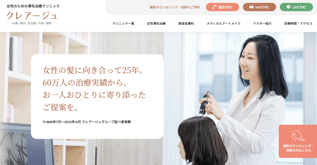 ![]() クレアージュ | 女性薄毛治療実績60万人超の長年信頼 女性専用スタッフ配置と個別処方体制 有楽町駅直結アクセス良好の通院利便 | 公式サイト |